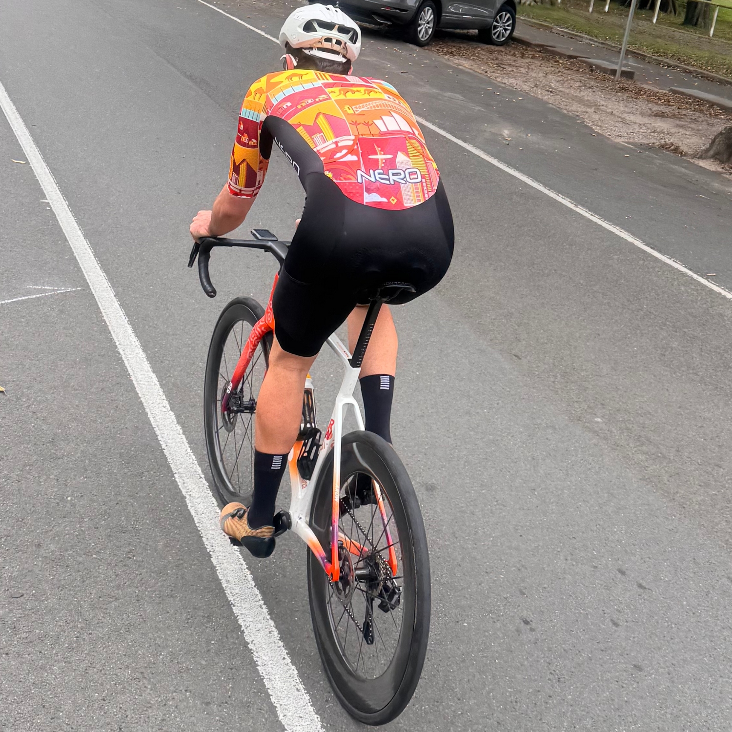 The ultimate race skinsuit for those who like to fuel. The same fit and fabric as all our previous NERO suits with cargo leg pockets and an added storage pocket behind the neck: